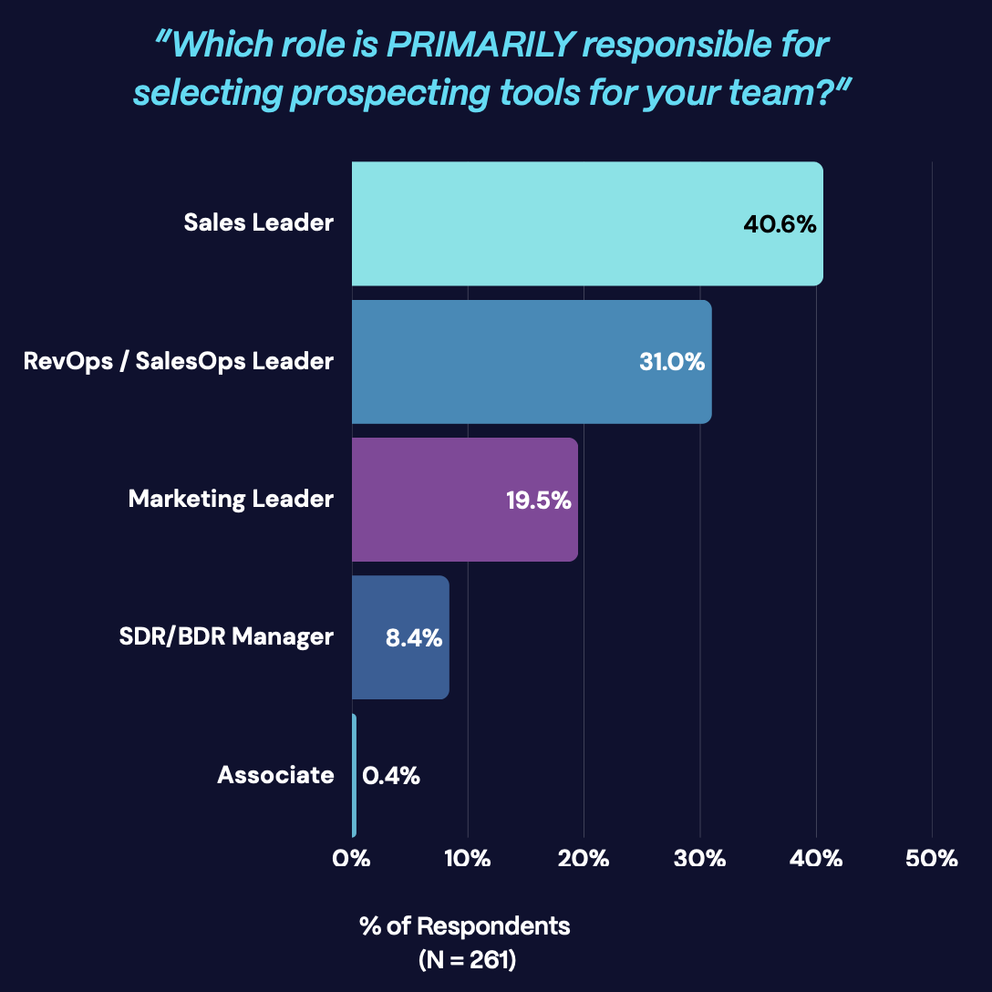 Roughly 91% of tech stack decisions come from department heads — sales, revOps, or marketing — while only 9% include input from SDR or BDR managers and the reps closest to the work.