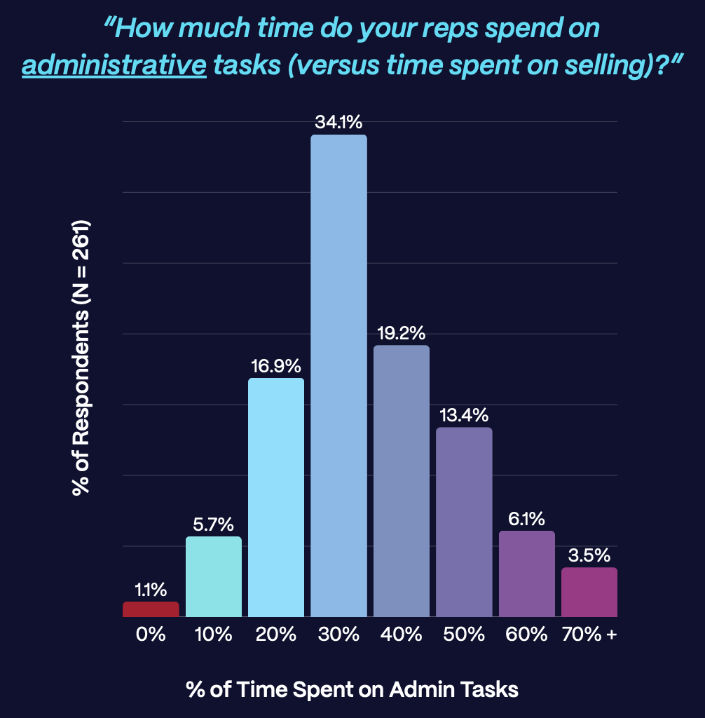 - Efficiency. Just over half (~58%) of respondents said admin tasks take up to 30% of a rep’s week. About one-third (~33%) said admin consumes 40–50% of rep time, and another ~10% said it’s 60% or more. Only ~1% of teams reported zero admin burden — proving it’s possible, but rare.