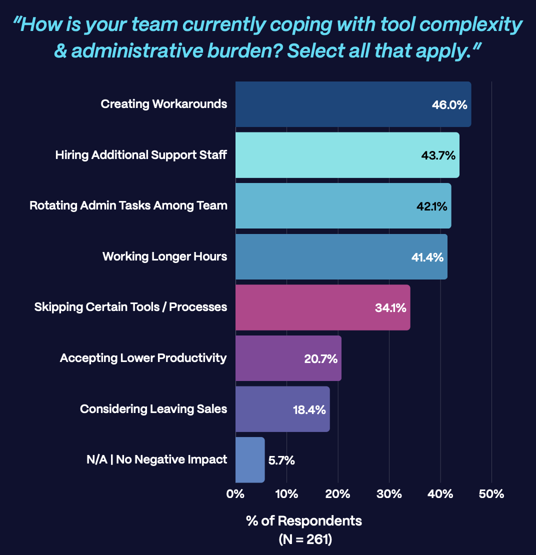 The downstream effects are predictable. A third of teams (34%) say reps are skipping certain processes entirely just to keep up. A shocking 18% say reps are considering leaving sales altogether.