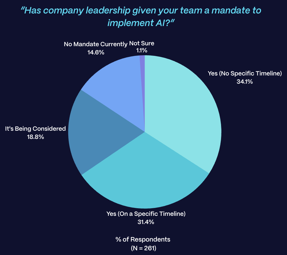 Two-thirds of companies (66%) now have a formal AI mandate, and about one-third (31%) are working against a defined timeline. Another 19% are still considering it, leaving only a small minority (~15%) without a mandate at all.