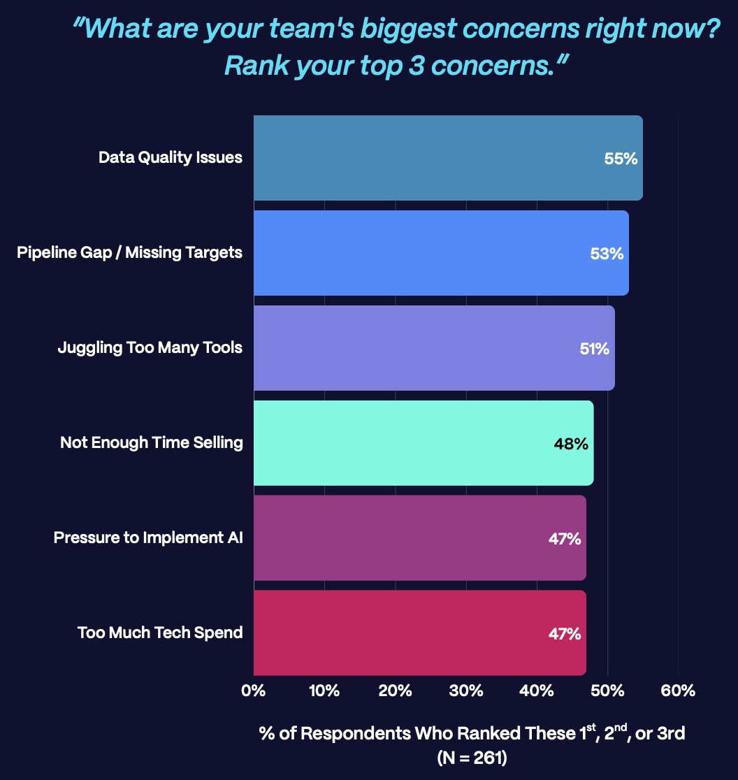 - Data quality. More than half of leaders (55%) cited it as a top-three concern — and for good reason. When your contact information is outdated, your firmographic data is incomplete, or your intent signals are unreliable, reps waste time chasing dead ends.